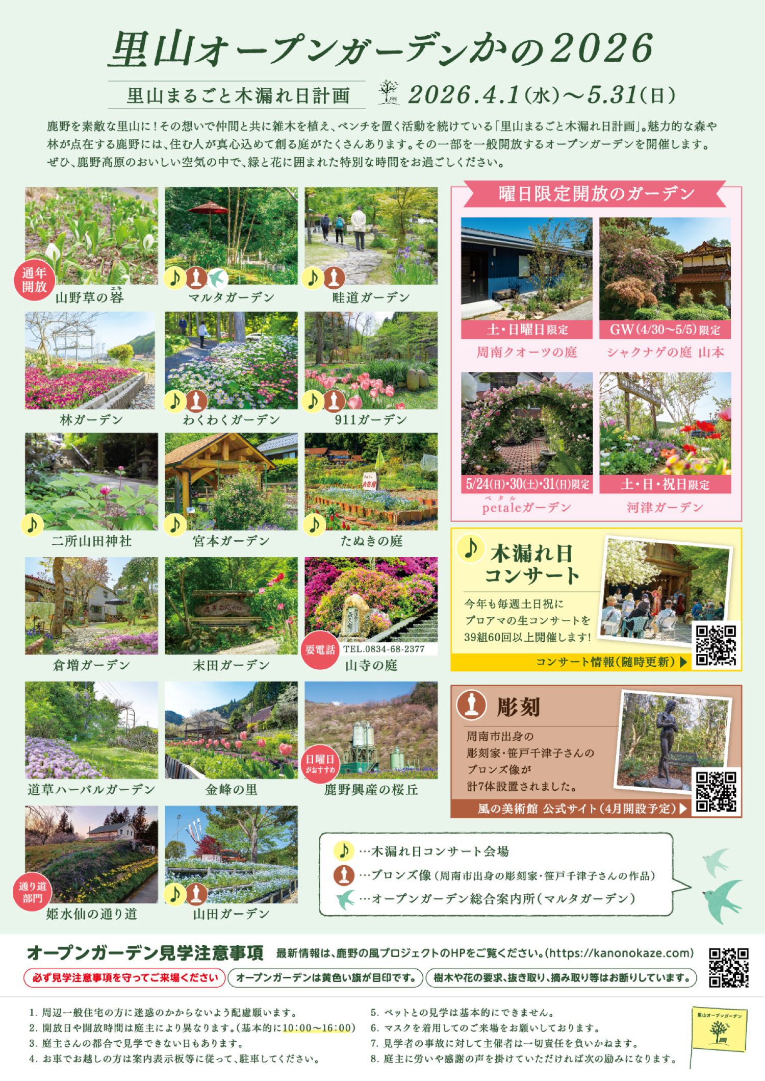 お知らせ 里山オープンガーデンかの2026 2026年3月1日 たぬきのおじさん 今年も4月から行います。 「オープンガーデンかの」 17庭が参加し、自慢の庭を見ていただこうとの企画です。 たぬきの庭も参加します。 一か月後に備えて準備をはじめました。 4月からの開催を楽しみにお待ちください。 インスタでも随時紹介しています。 「tanukino-ojisan 」 で検索してください。